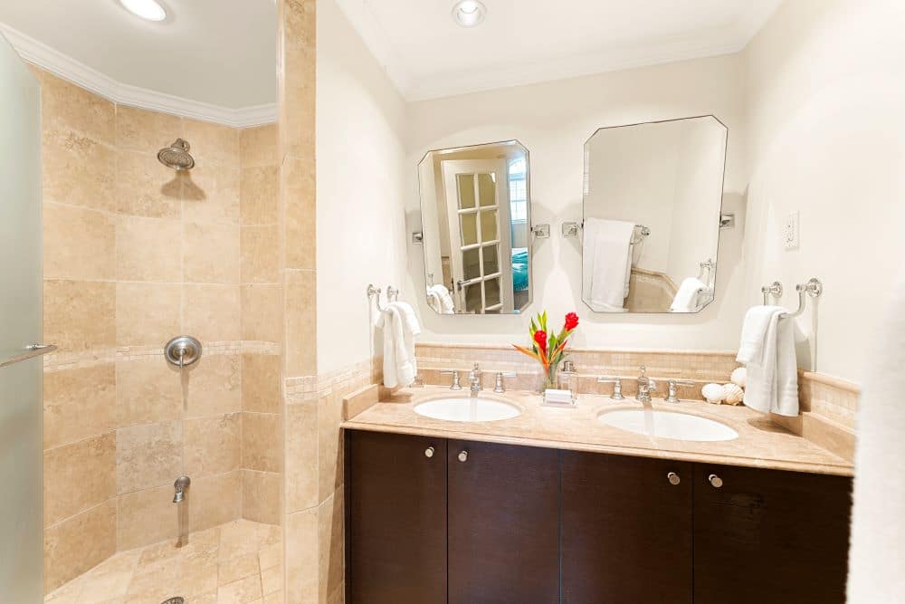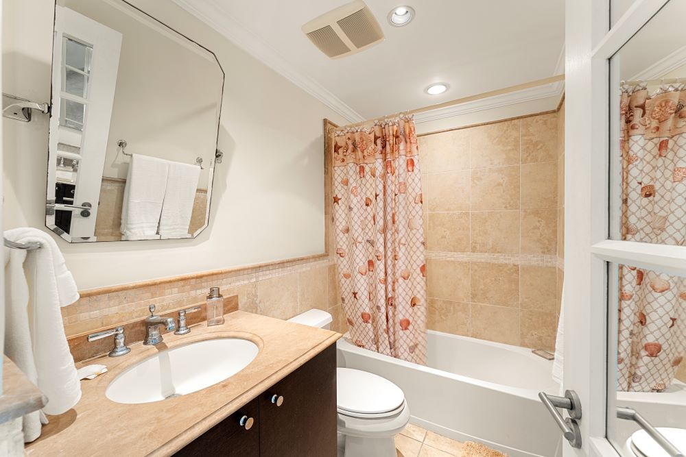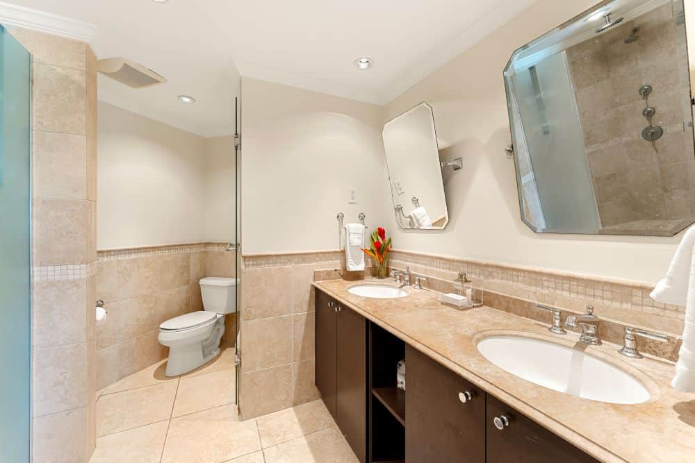 The master bedroom is en-suite with large walk-in closets and sliding doors leading to the covered living room balcony where you can enjoy full ocean views. Bedroom two is also en-suite with his and her sinks and walk-in closet. Bedroom three / study is adjacent to a full third bathroom with a shower.